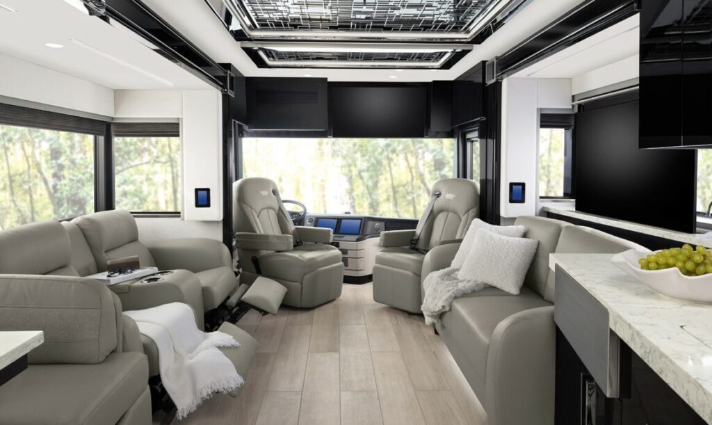 Motorhome Luxuoso:A sala de estar é um verdadeiro cinema em casa, com um sistema de entretenimento completo que inclui uma TV de alta definição, sistema de som surround e conexão à internet via satélite. O mobiliário é composto por sofás reclináveis e mesas ajustáveis, oferecendo conforto e praticidade.