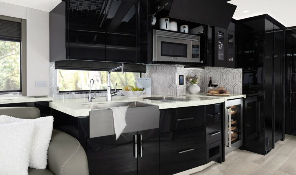 Motorhome Luxuoso:A cozinha deste motorhome é um sonho para qualquer chef. Equipada com eletrodomésticos de última geração, incluindo um fogão de indução, forno de micro-ondas, geladeira de grande capacidade e uma adega climatizada, ela permite preparar refeições sofisticadas em qualquer lugar.