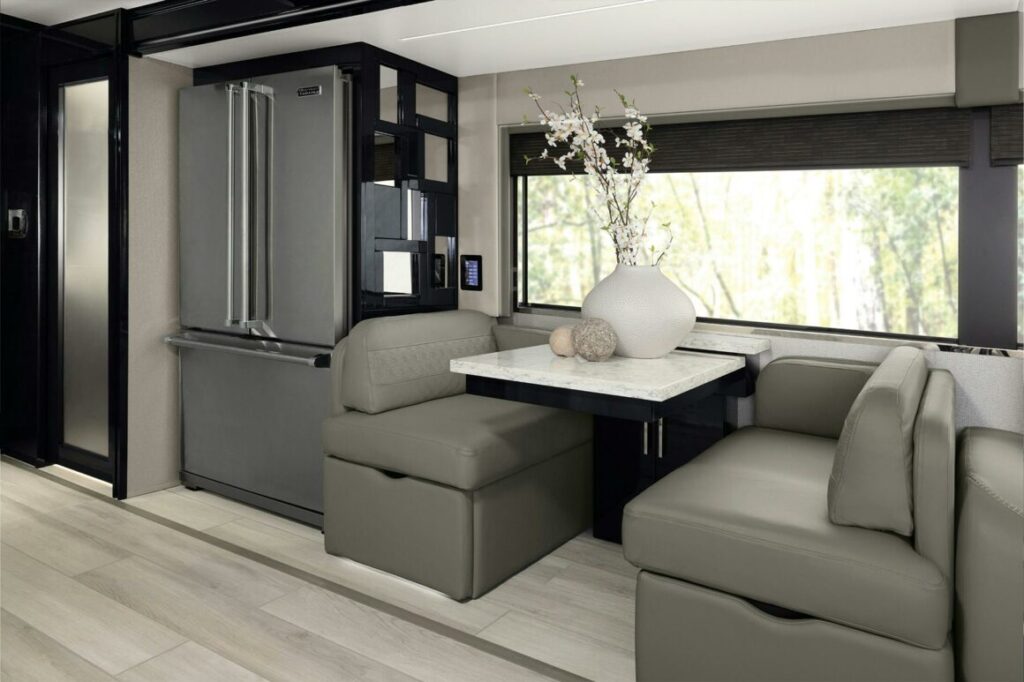 Motorhome Luxuoso:Ao entrar no motorhome, somos recebidos por um ambiente luxuoso e acolhedor. Os interiores são decorados com materiais premium, como mármore, madeira nobre e couro de alta qualidade. Cada detalhe é pensado para proporcionar o máximo conforto e elegância.