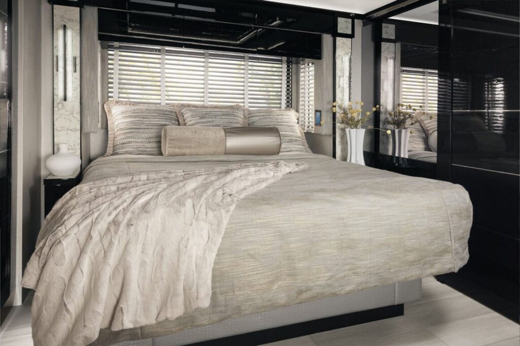 Motorhome Luxuoso:O quarto principal é digno de um hotel cinco estrelas, com uma cama king size, guarda-roupas espaçosos e um banheiro privativo com chuveiro e banheira de hidromassagem. Além disso, há suítes adicionais para convidados, todas igualmente bem equipadas.